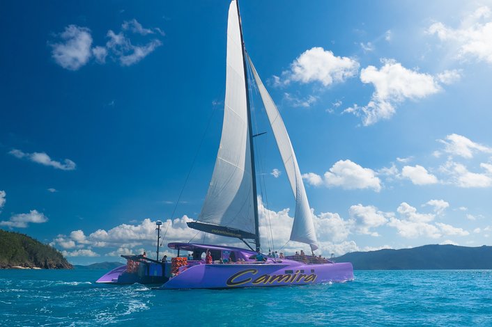 Experience the wonders of the Whitsundays on this full day cruise on board Camira – our big purple catamaran! Sail through the azure blue waters of the Whitsunday Islands, walk to hill Inlet, snorkelling the inner reef and enjoy a sumptuous BBQ lunch.